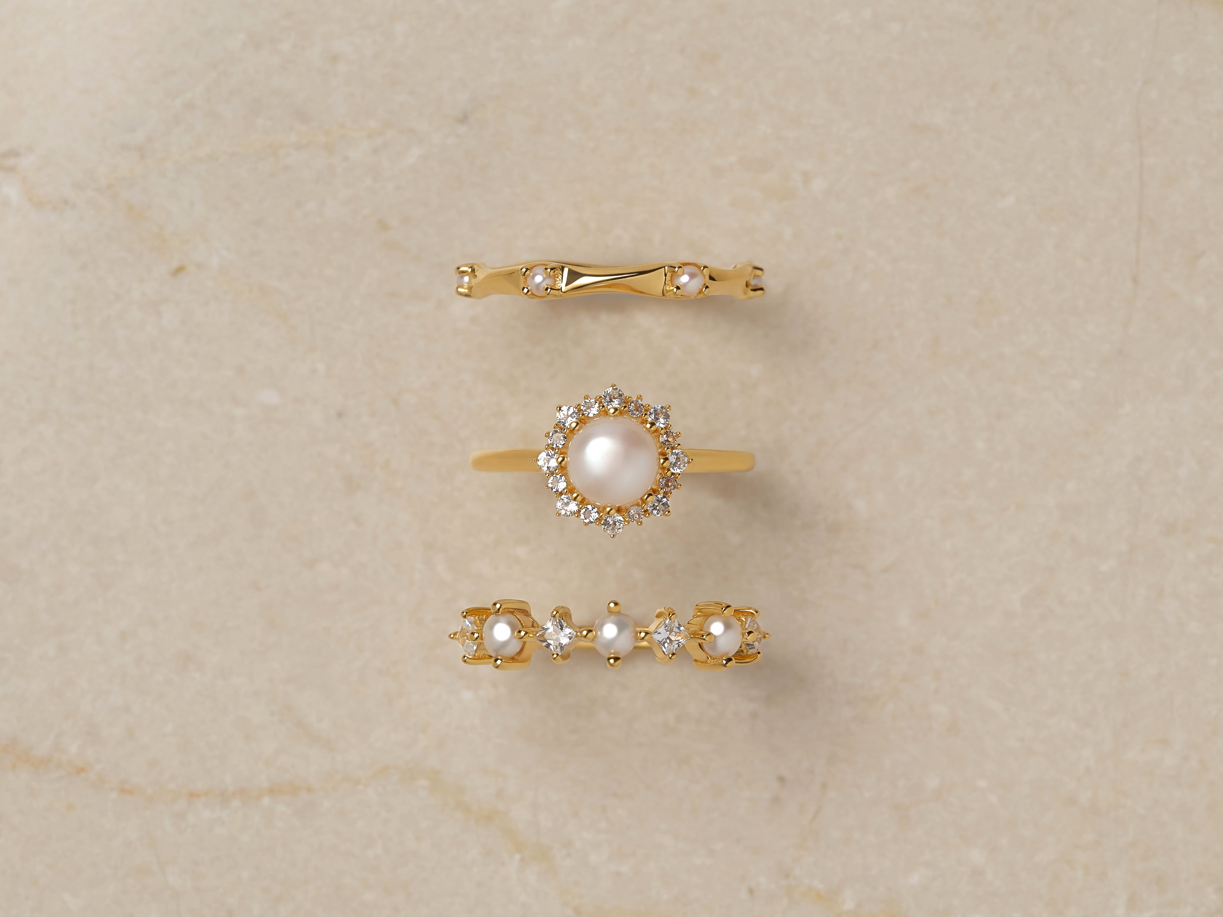 淡水パールを中心に、小さなホワイトトパーズを繊細にあしらったリング。